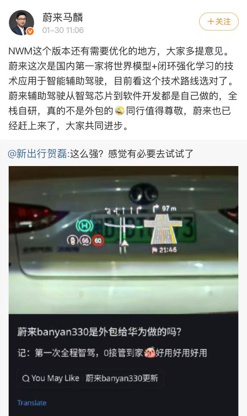 蔚来智驾是外包给华为做的吗?马麟回应称从芯片到软件全栈自研