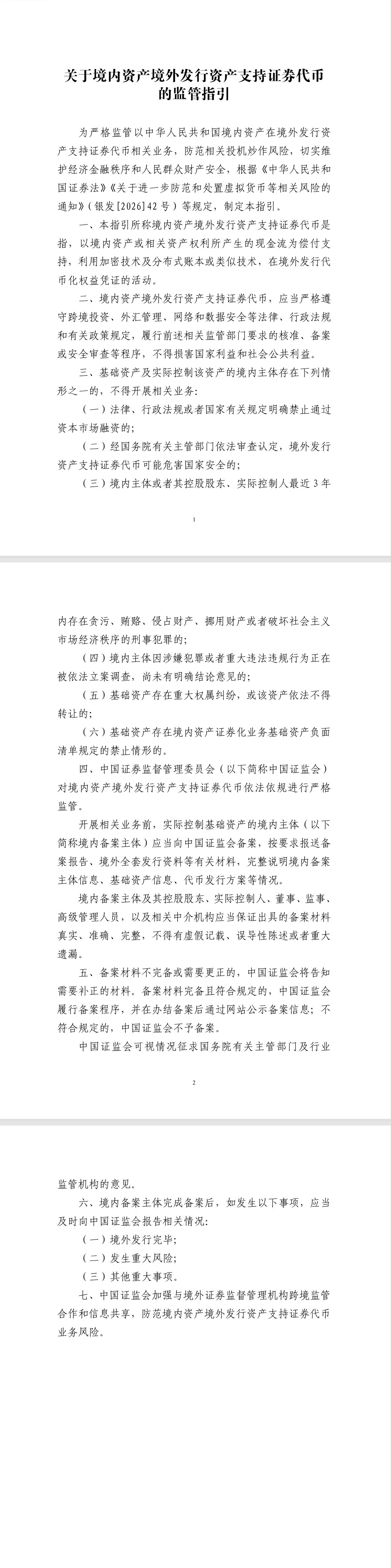 事关资产支持证券代币化!证监会2026年1号公告来了,境内资产境外发行资产支持证券代币应严格遵守跨境投资等规定