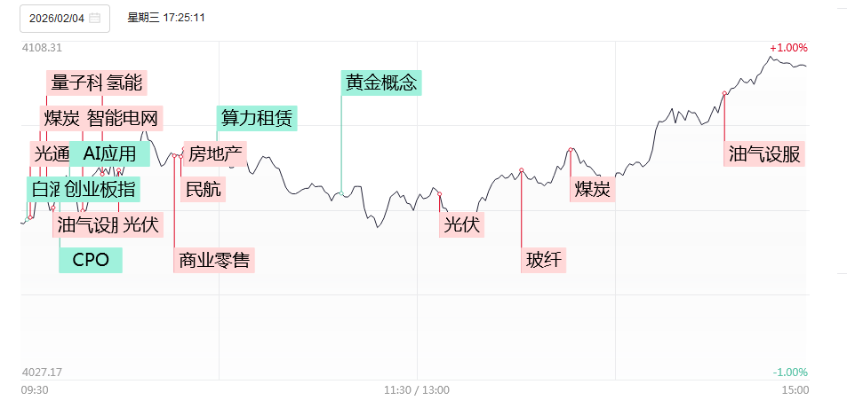 2月4日,市场探底回升,沪指重返4100点,深成指翻红,此前一度跌超1%,创业板指午后跌幅收窄。截至收盘,沪指涨0.85%,深成指涨0.21%,创业板指跌0.4%。沪深两市成交额2.48万亿,较上一