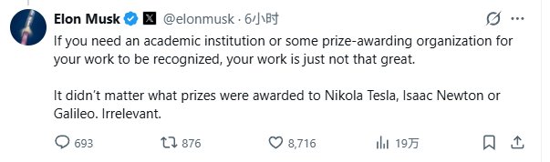 马斯克:如果你需要学术机构或颁奖组织来认可你的工作 那说明你的工作并没那么出色