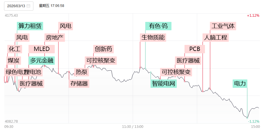 3月13日,市场全天震荡调整,尾盘快速下挫,沪指盘中跌超1%。截至收盘,沪指跌0.81%,深成指跌0.65%,创业板指跌0.22%。沪深两市成交额2.4万亿,较上一个交易日缩量416亿。盘面上,局部
