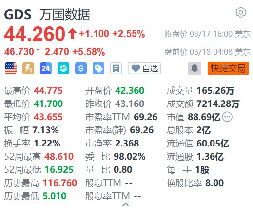 万国数据盘前涨超5% 绩后获多家大行看好
