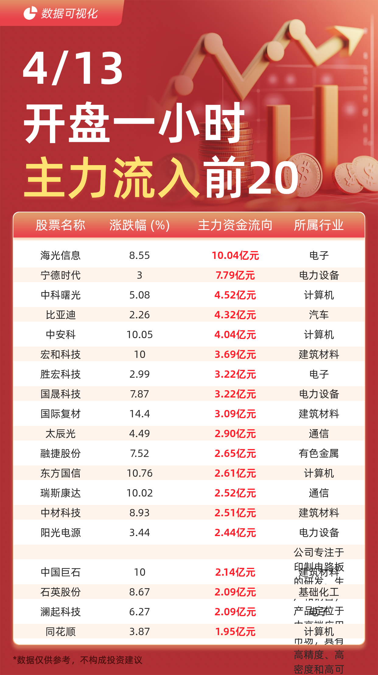 据交易所数据显示,截至4月13日开盘一小时,主力资金流入前20的股票分别为:海光信息(10.04亿元)、宁德时代(7.79亿元)、中科曙光(4.52亿元)、比亚迪(4.32亿元)、中安科(4.04亿元)、宏和科技(3.69亿元)、胜宏科技(3.22亿元)、国晟科技(3.22亿元)、国际复材(3.09亿元)、太辰光(2.90亿元)、融捷股份(2.65亿元)、东方国信(2.61亿元)、瑞斯康达(2.52亿元)、中材科技(2.51亿元)、阳光电源(2.44亿元)、C红板(2.23亿元)、中国巨石(2.14亿元)、石英股份(2.09亿元)、澜起科技(2.09亿元)、同花顺(1.95亿元)。