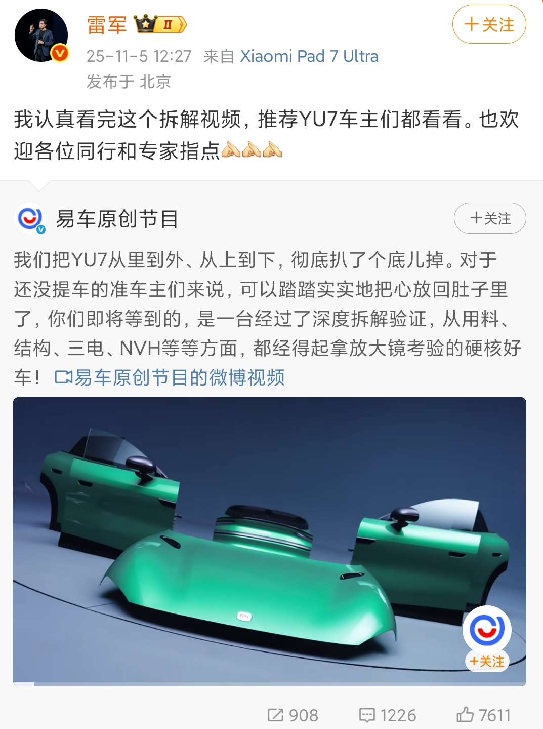 11月5日,易车原创节目发布了“全网首拆小米YU7”视频,获得了小米公司董事长雷军的关注。易车原创节目表示,小米YU7是一台“从用料、结构、三电、NVH等等方面,都经得起拿放大镜考验的硬核好车”。雷