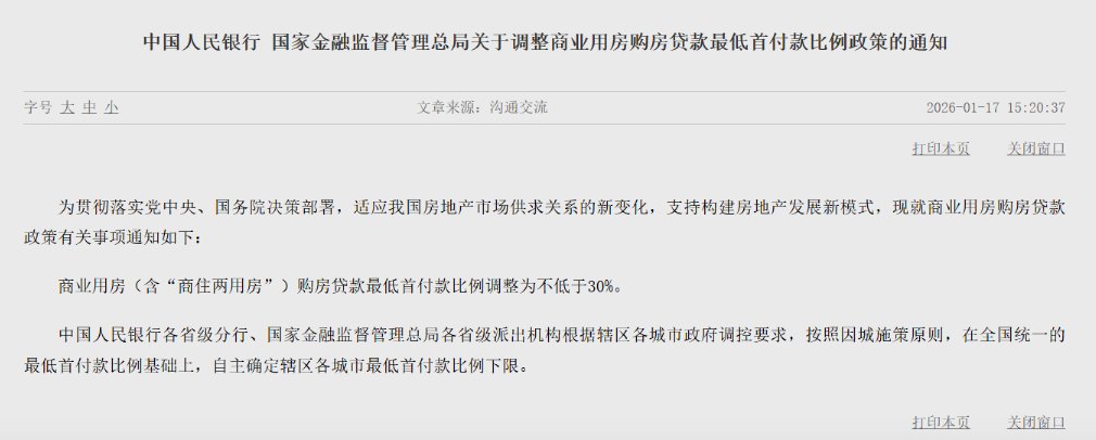 央行等两部门:商业用房(含“商住两用房”)购房贷款最低首付款比例调整为不低于30%