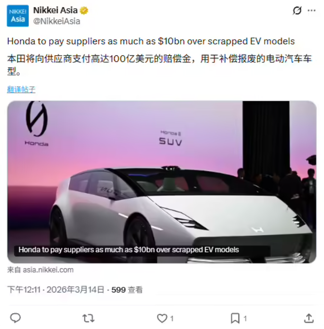 EV 战略急刹车:本田放弃三款电动车型开发,需向供应商支付最高 1.7 万亿日元补偿