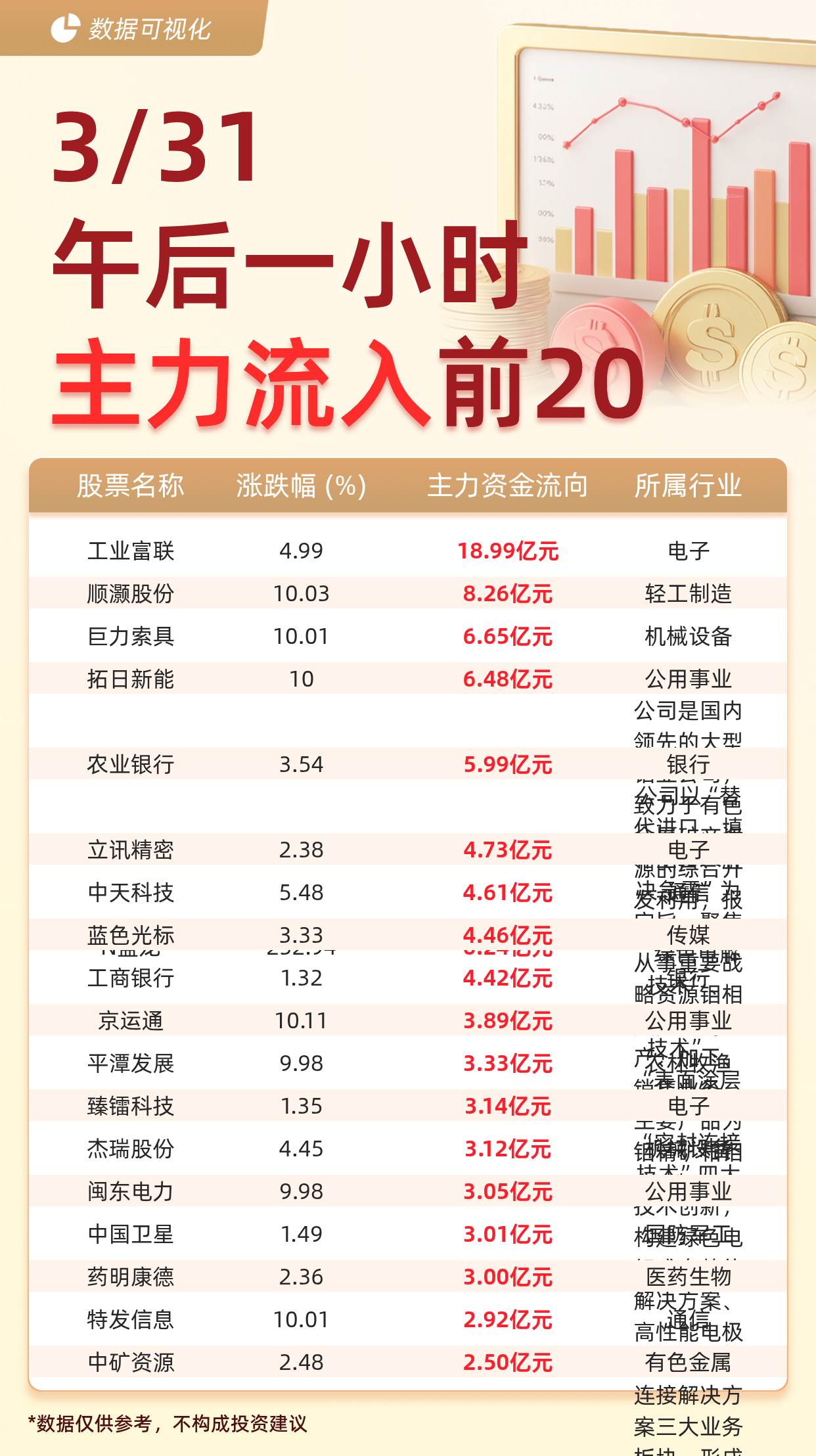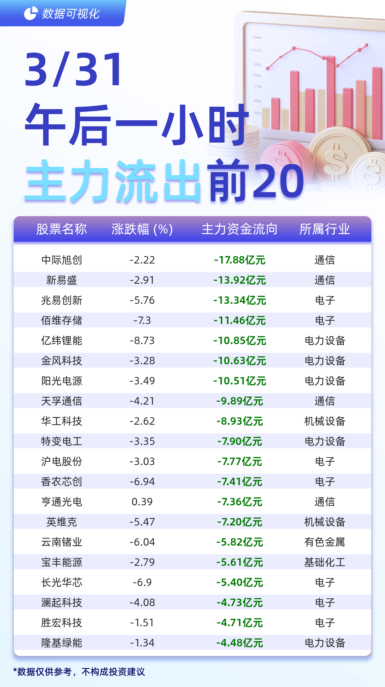【主力个股资金流出前20:中际旭创流出17.88亿元、新易盛流出13.92亿元】据交易所数据显示,截至3月31日午后一小时,主力资金流出前20的股票分别为:中际旭创(-17.88亿元)、新易盛(-13.92亿元)、兆易创新(-13.34亿元)、佰维存储(-11.46亿元)、亿纬锂能(-10.85亿元)、金风科技(-10.63亿元)、阳光电源(-10.51亿元)、天孚通信(-9.89亿元)、华工科技(-8.93亿元)、特变电工(-7.90亿元)、沪电股份(-7.77亿元)、香农芯创(-7.41亿元)、亨通光电(-7.36亿元)、英维克(-7.20亿元)、云南锗业(-5.82亿元)、宝丰能源(-5.61亿元)、长光华芯(-5.40亿元)、澜起科技(-4.73亿元)、胜宏科技(-4.71亿元)、隆基绿能(-4.48亿元)。