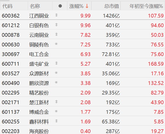 LME铜价创纪录新高,铜概念股走强,江西铜业、白银有色涨停
