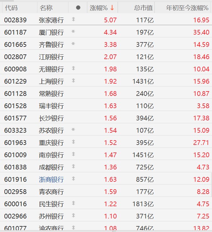 银行股普涨,张家港行涨5%,厦门银行涨超4%