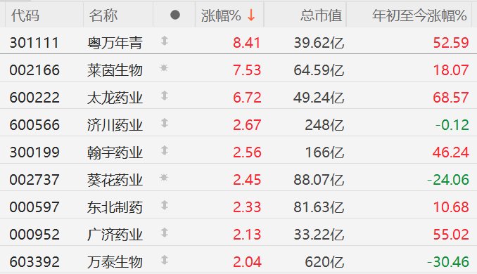流感概念股走强,粤万年青涨超8%,太龙药业涨超6%