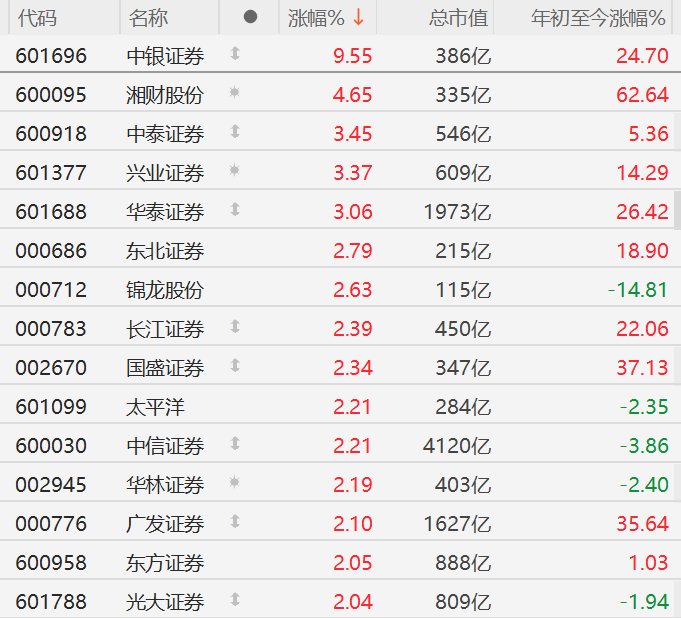 券商股涨幅进一步扩大,中银证券涨停,兴业证券涨超8%