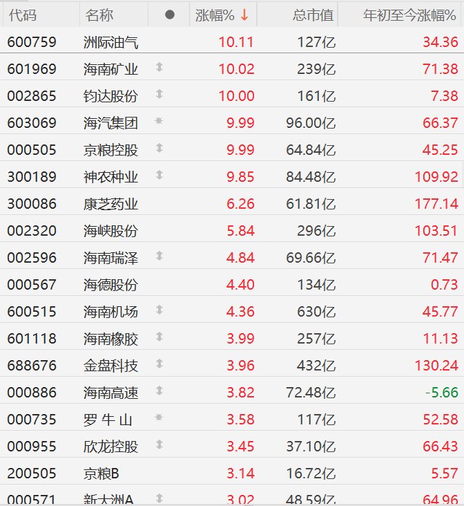 海南板块全线上涨,海南矿业、海汽集团等涨停