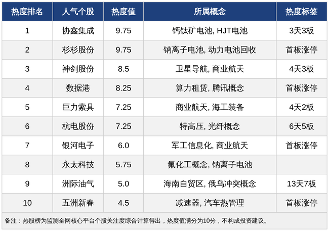 今日十大热股:协鑫集成、杉杉股份携手登顶热股榜,神剑股份、数据港涨停潮持续,商业航天概念全面爆发