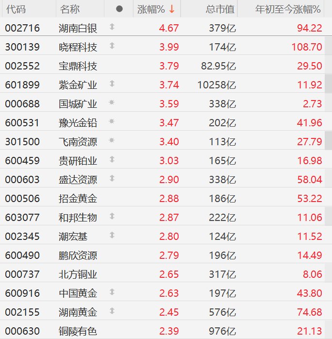 黄金概念股普涨,湖南白银涨超4%,紫金矿业涨超3%