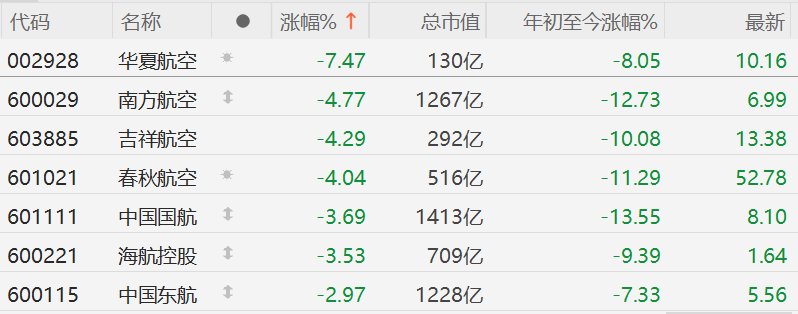 航空股集体下挫,华夏航空跌超7%,春秋航空跌超4%