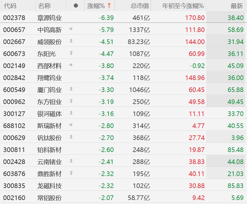 有色金属股普跌,章源钨业跌超6%,中钨高新跌超5%
