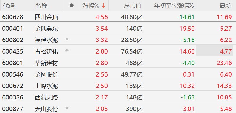 水泥股普涨,四川金顶涨超4%,全国多地通知上调价格