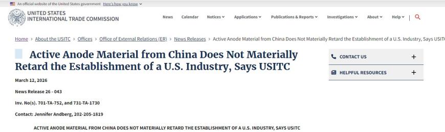 推翻美国商务部此前的裁定 ITC:将不对进口自中国的活性阳极材料征收双反关税