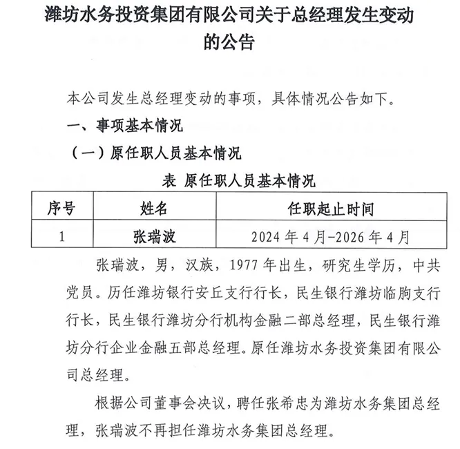 潍坊水务集团总经理换人:56岁张希忠履新,49岁张瑞波卸任