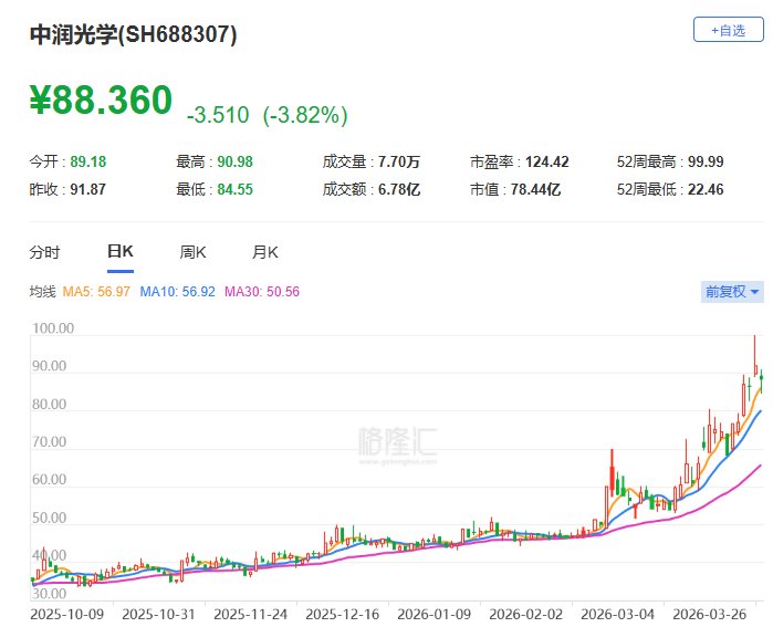 中润光学一度跌近8% 昨日盘中创历史新高 股东拟减持