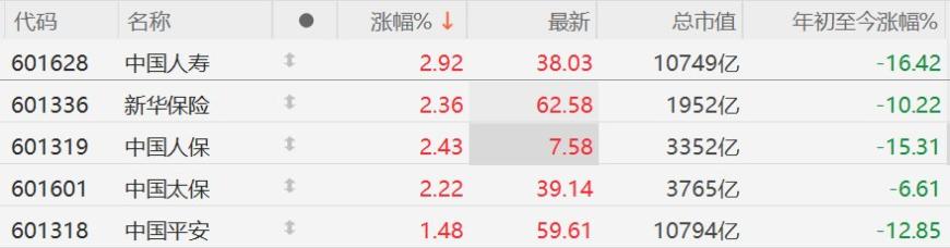 A股保险股集体上涨,中国人寿涨近3%