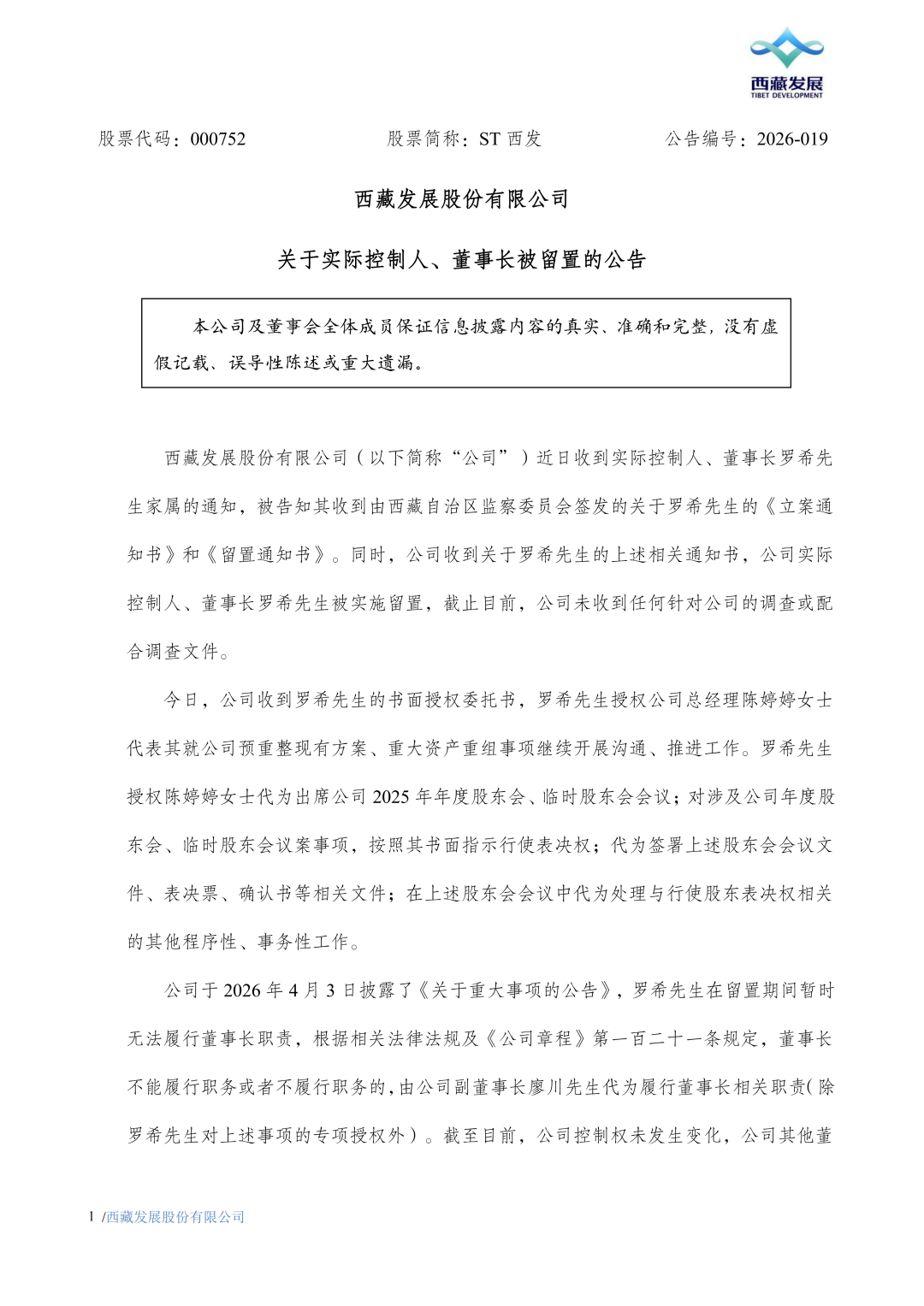 ST西发:实际控制人、董事长罗希被留置