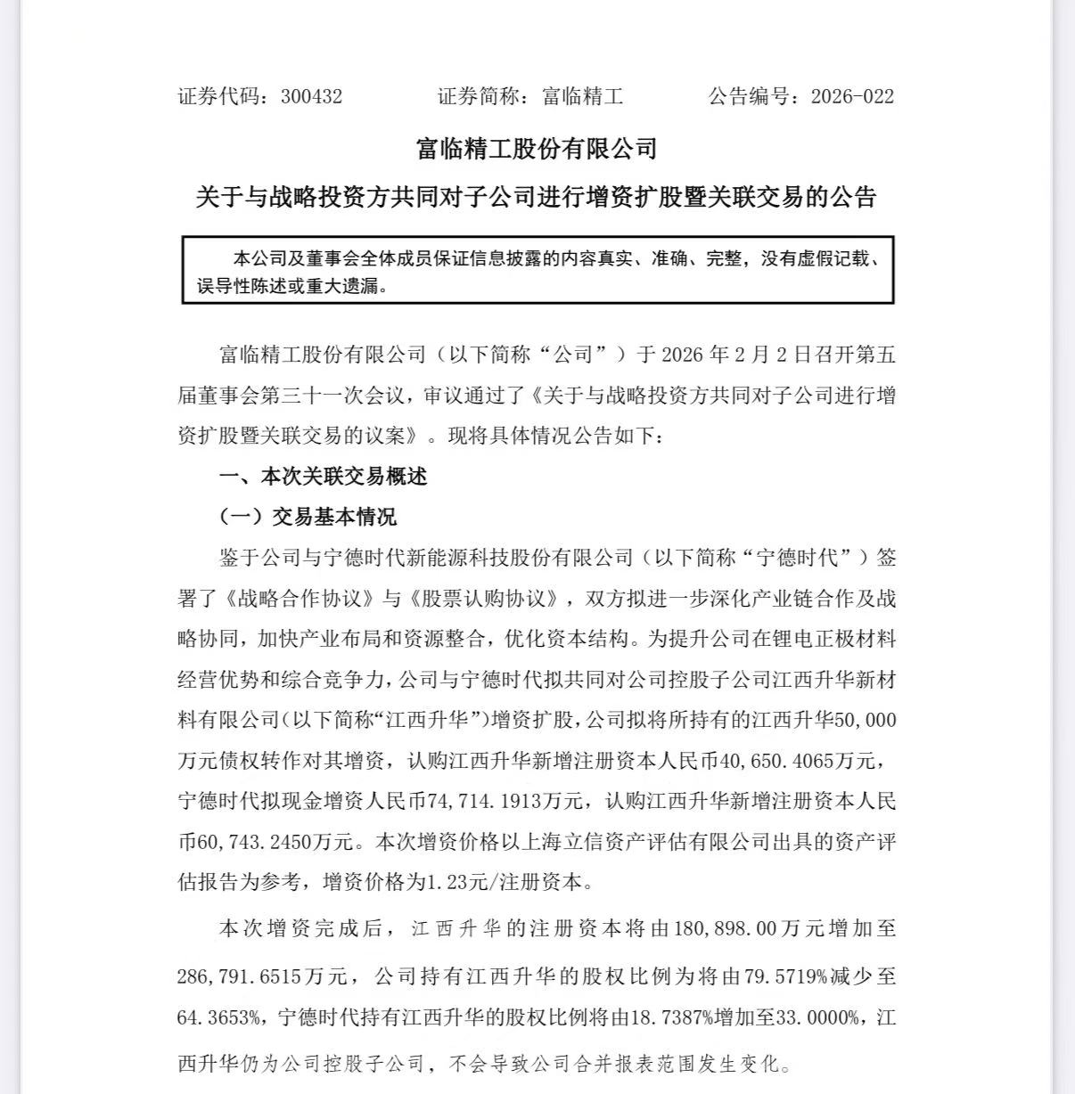 富临精工:与宁德时代共同对子公司江西升华增资扩股