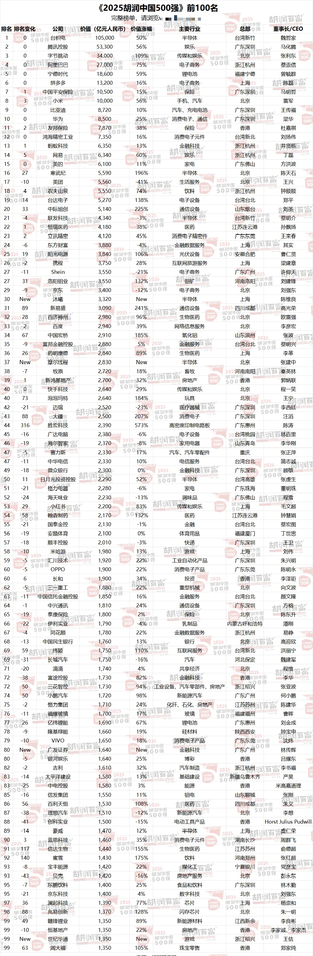 《2025胡润中国500强》发布,小米、比亚迪、华为进入前十