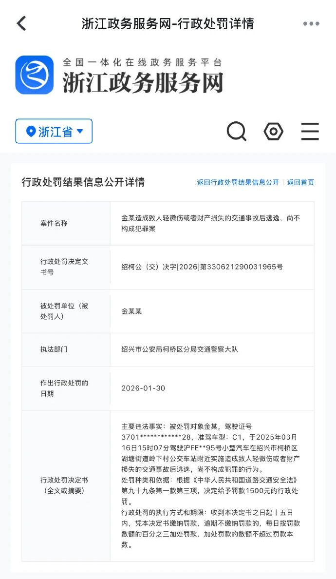 演员金晨交通事故处罚结果公开:罚款1500元