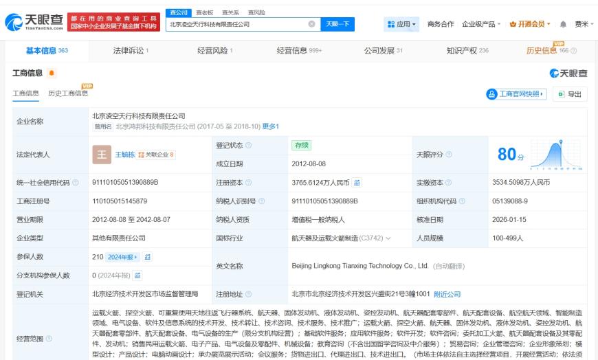 北京市商业航天和低空经济产业基金等入股凌空天行
