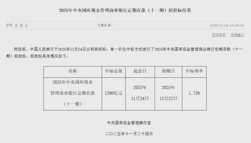 财政部1个月期国库现金定存中标利率1.73%