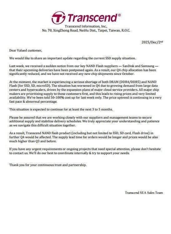 NAND Flash缺货加剧,创见自10月后再未收到三星与闪迪出货