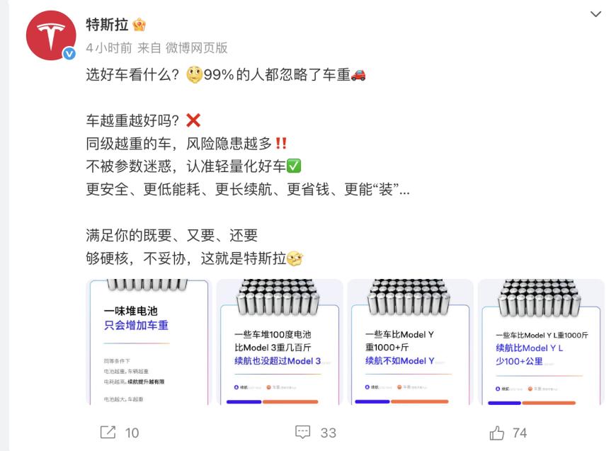 特斯拉发文:一味堆电池只会增加车重,一些车100度电池续航也没超过Model 3