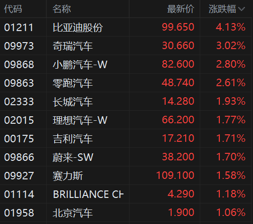 港股汽车股普涨,比亚迪股份涨超4%,中欧电车案获进展,对欧出口预计年增20%