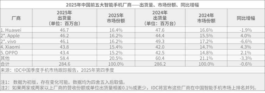IDC:2025年华为重返中国市场第一,OPPO四季度增长超10%