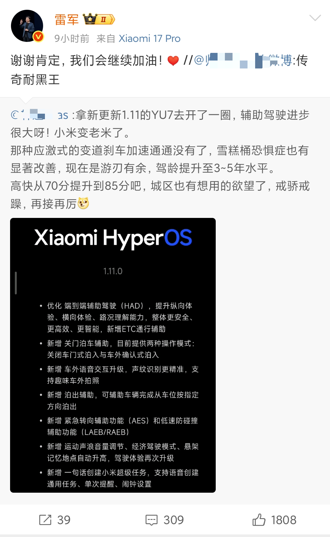 网友称赞小米汽车智驾更新后进步很大,雷军回应“谢谢肯定”