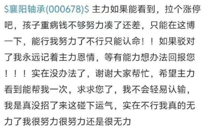 A股再现离奇涨停!“真没招了,孩子生病钱不够,主力求您拉个涨停……”,疑股民发帖求助,随后襄阳轴承直线涨停,要复制“爷叔与上海建工”炒作一幕?