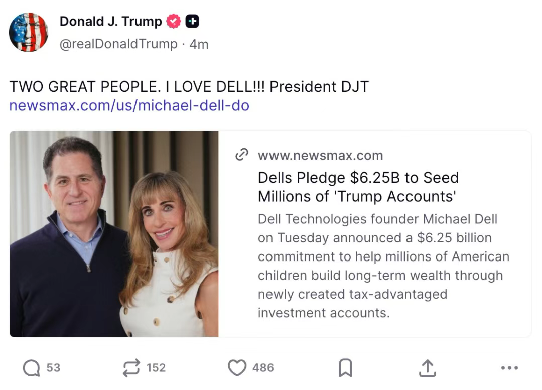 戴尔创始人夫妇豪捐62亿美元,给2500万名美国儿童买美股,特朗普盛赞:两位伟大的人,我爱戴尔