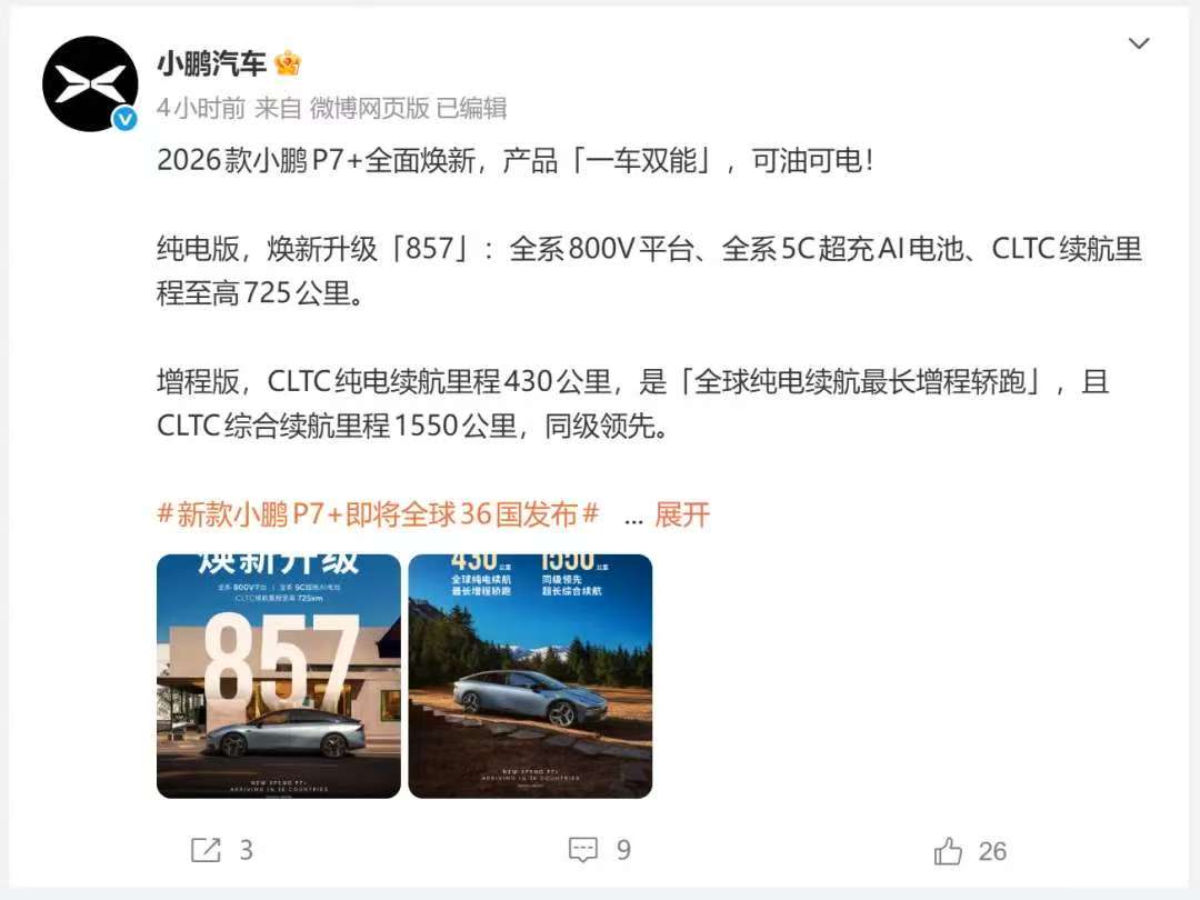 小鹏第二款增程车型发布,纯电续航430公里,综合续航1550公里