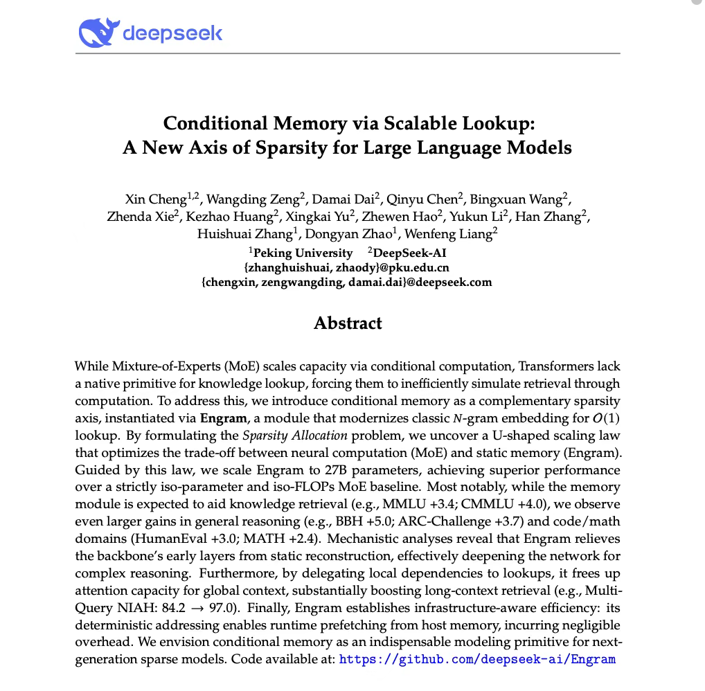 DeepSeek V4路线图隐现?梁文锋署名重磅论文发布,聚焦大模型条件记忆模块