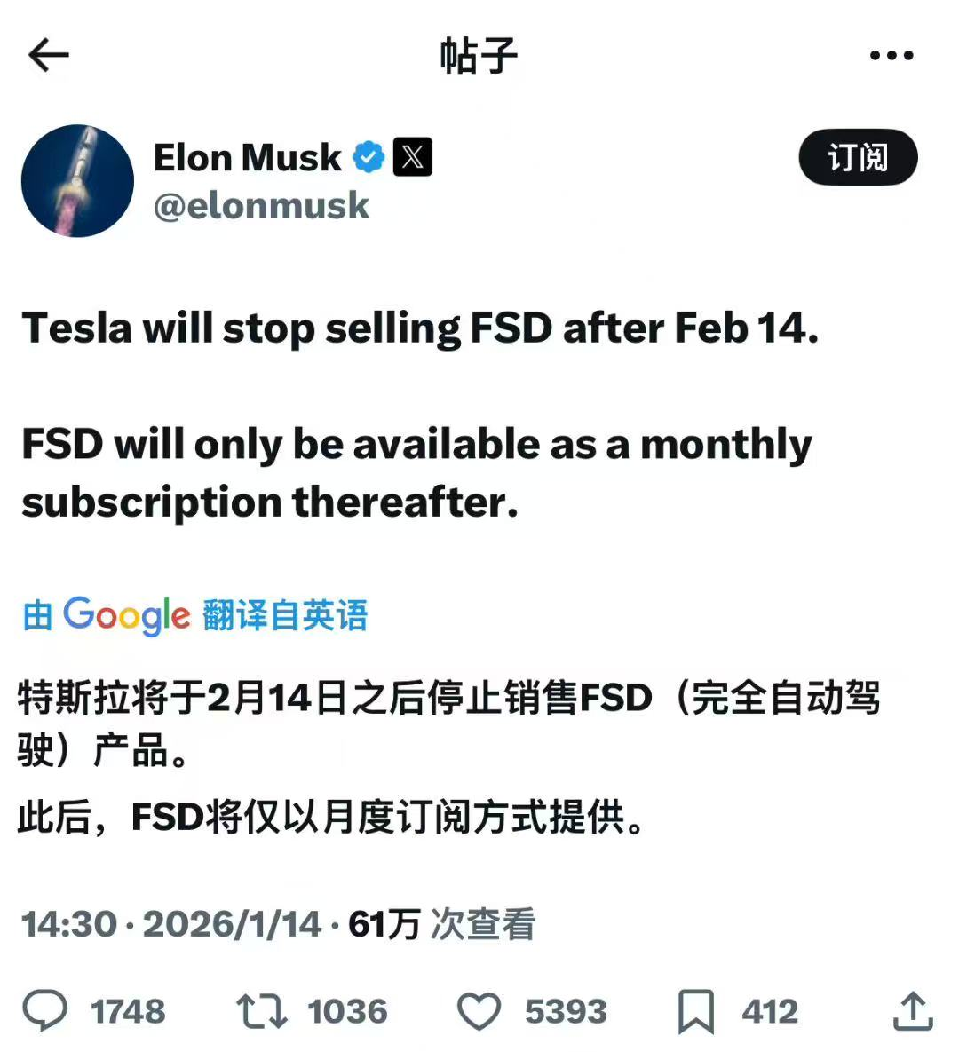 马斯克:特斯拉将在2月14日后停售FSD,此后仅提供月度订阅方式
