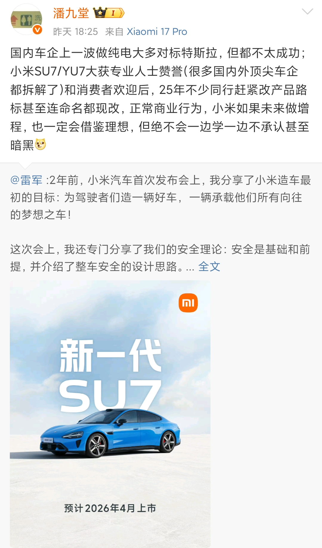 小米潘九堂:小米如果未来做增程,一定会借鉴理想