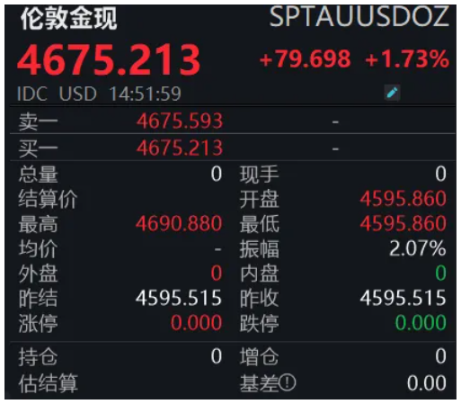 黄金股盘中上扬!现货黄金、白银均创历史新高,一度站上4690美元/盎司、94美元/盎司关口